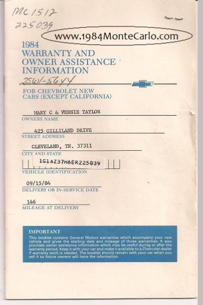 The Monte Carlo was sold New at Walter Jackson Chevrolet, Ringgold GA to a lady in nearby Cleveland TN